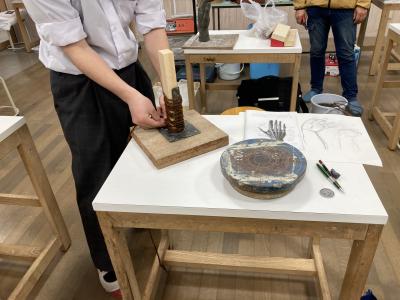 本日より2日間、美術科メディア芸術科を対象に、春季実技講習会を実施しています。今回もトーリン美術予備校の先生方にご指導いただいています。また、彫刻家の北沢先生にもお越しいただいています。どんな作品が仕上がるか楽しみです。