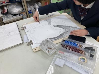 3月25日・26日の2日間、美術科・メディア芸術科合同の春季実技講習会を開催しました。今回は、トーリン美術予備校の先生方と、笠間で活動されているアーティストの三澤先生にご指導いただきました。講習は、静物デッサン、平面構成、静物着彩、総合型入試対策の4講座に分かれて実施しました。総合型入試対策講座では、深海や宇宙を想定したデザインの提案をプレゼンまで行う課題です。とても充実した2日間になりました。
